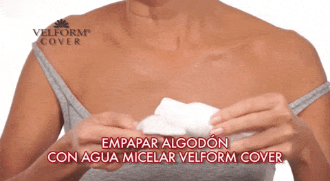 Empape de agua micelar Velform® un disco de algodón y deslícelo presionando suavemente sin frotar.